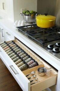 - Built-In Spice Racks: Narrow pull-out compartments near the stove to keep spices within arm’s reach.