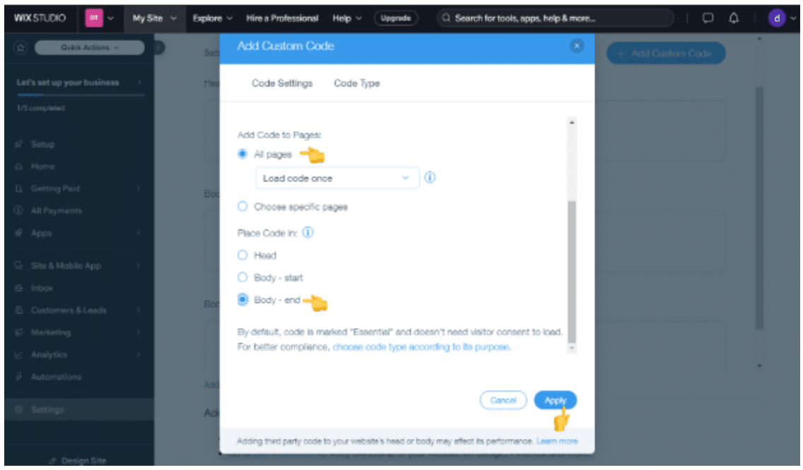 Set the code to load on All Pages (or select specific pages if preferred).